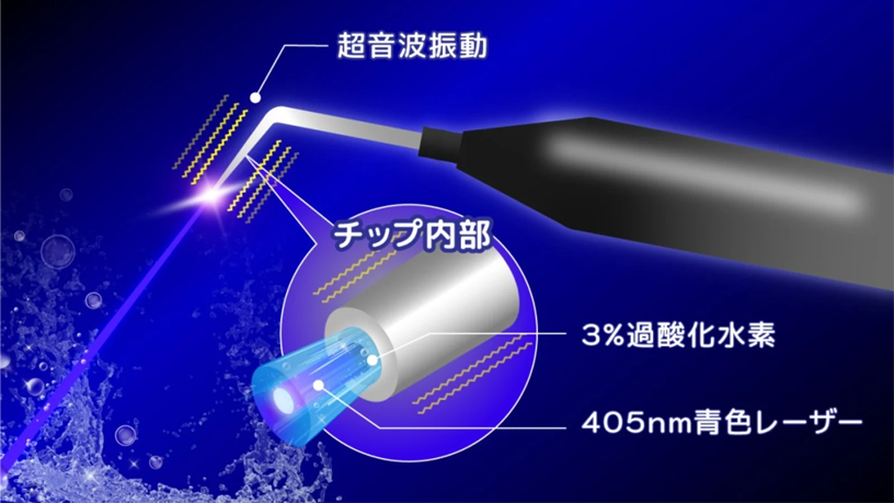 3%過酸化水素水と405nm青色レーザー照射による「ラジカル殺菌」は、短時間でのデンタルプラーク内部の殺菌に成功した世界初の技術となります。歯周ポケット内に対して超音波振動 × ラジカル殺菌を行うことで、口内細菌を99.99%殺菌することができるため、重度歯周病においても非外科処置でも歯を保存する可能性を高めることができる新たな治療機器となります。